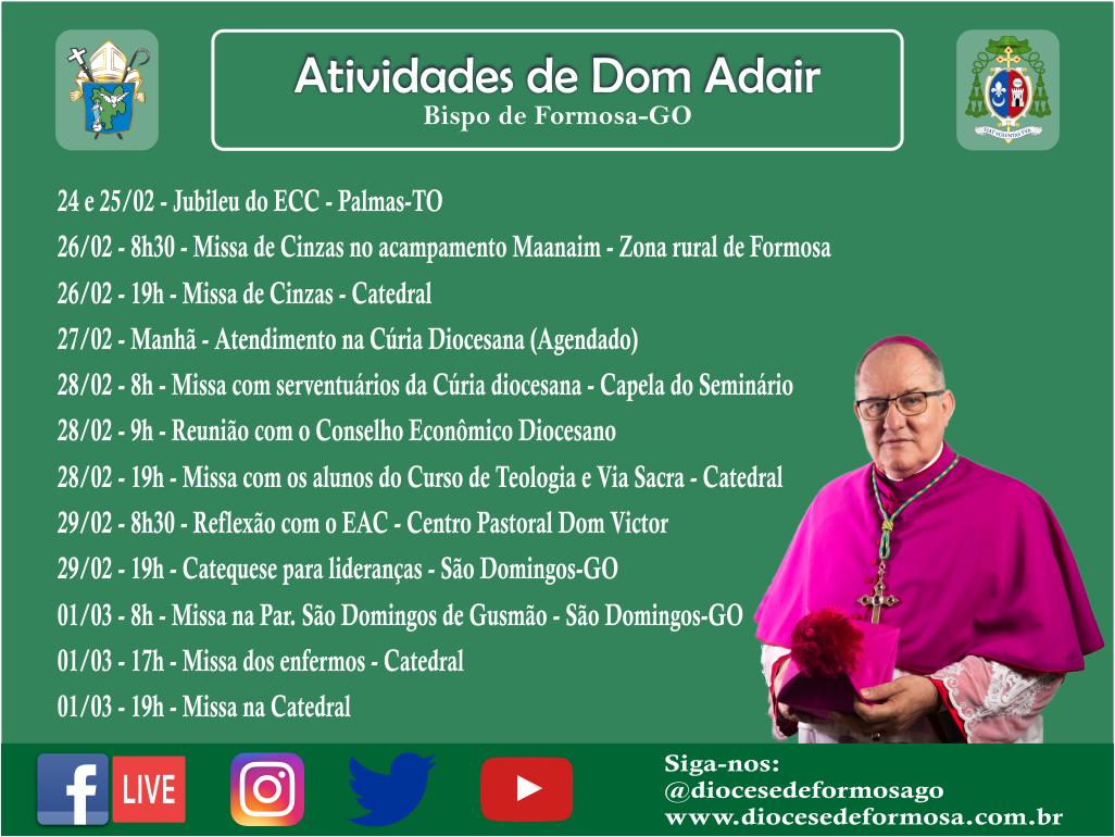 Início Notícias Igreja Diocesana Agenda do Exmo Sr° Bispo para esta semana (24/02 a 01/03)NotíciasIgreja DiocesanaAgenda do Exmo Sr° Bispo para esta semana (24/02 a 01/03)Por Reginaldo Mendonça - 24 de fevereiro de 202011820 FacebookTwitterWhatsAppLinkedinPrintTelegramVK ARTIGOS RELACIONADOSMais do autor DestaqueOrdenação Sacerdotal do Diácono Bruno e Ordenação Diaconal do Seminarista Gabriel DestaqueComunicado de Alteração no Clero DestaqueComemoração de Todos os Fiéis Defuntos